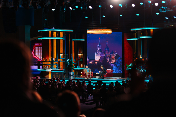 А по всему периметру установили 7 больших экранов, чтобы происходящее на сцене было хорошо видно из любой точки площадки. В специальном выпуске из «Зарядья» будет только живой звук, музыкальный бэнд исполнил даже все отбивки и джинглы программы.